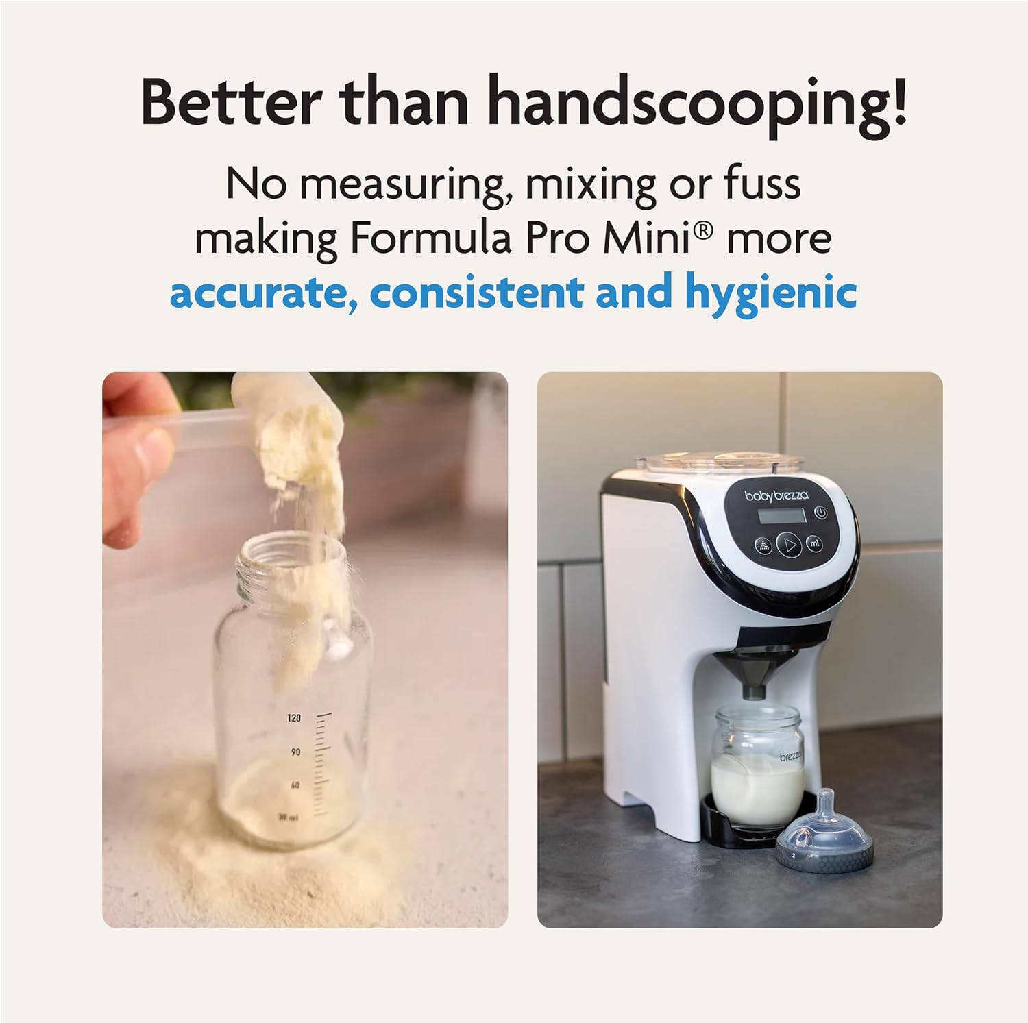 - ORE ACCURATE, CONSISTENT, HYGIENIC AND FASTER THAN HANDMADE BOTTLES: Formula dispensed from airtight powder container; Clinical study showed 1/3 of all bottles made by hand were inaccurate by 10% or more; Removable water tank is dishwasher-safe