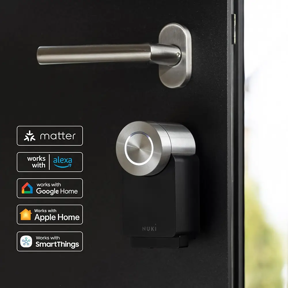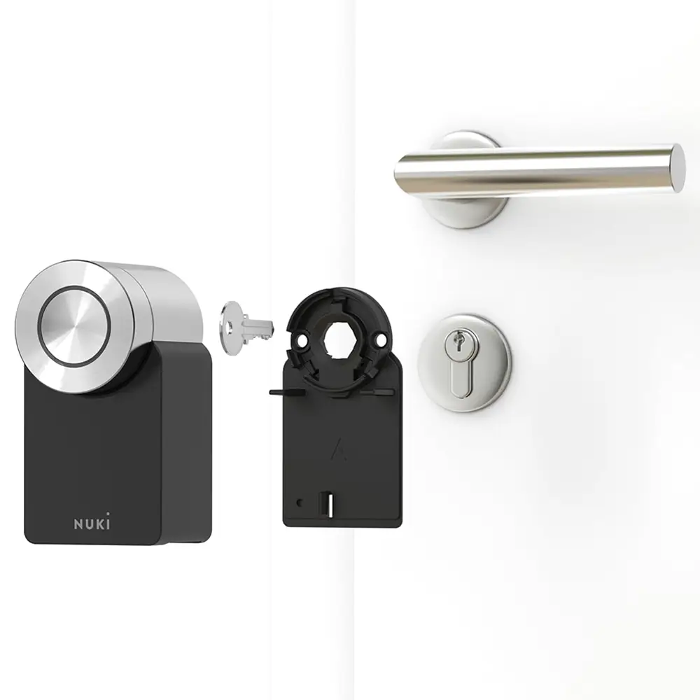 The Nuki Smart Lock Pro turns your smartphone into a key. With the free Nuki app you can open your front door in seconds with just one swipe or fully automatically. Assign up to 200 individual access permissions. Just look at the activity log and you’ll know who has come and gone, and when. Opening and locking doors while on the go is made possible thanks to the integrated WiFi module. The new Matter communication standard makes it easy to connect to existing Smart Home devices no matter the make or model. The optimized Power Pack features a battery life of up to six months on a single charge. Easy installation without screwing and drilling. Enhance your Nuki Smart Lock with our wide range of accessories. Check whether Nuki fits to your door: